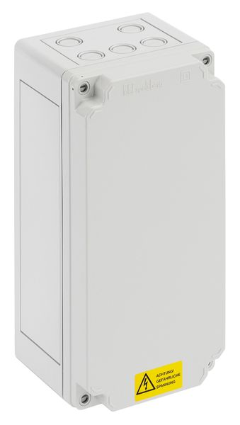 - Skriňa sieťovej prípojky pre 230 V trojfázové siete (L1-L2-PE), In=25 A, Imax=63 A, osadená: 2 x NH00 poistkový prvok, 1 x svorka PE, 1 x úložný výklenok pre 2 vodiče
