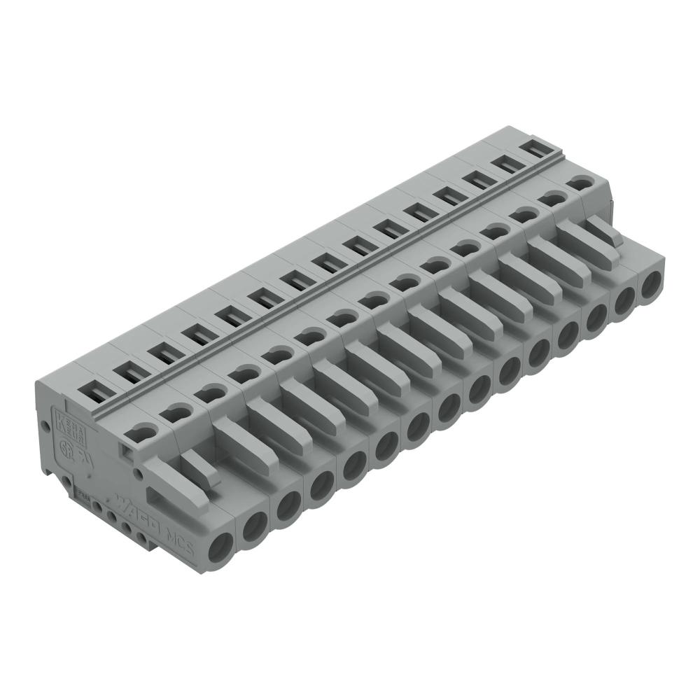 15-pólová zásuvková (samica) svorkovnica (plug-in connector) s technológiou CAGE CLAMP®. Má integrovanú montážnu pätku pre inštaláciu pomocou skrutiek a bočný prívod vodičov (Side-entry wiring). Určená pre prierezy od 0,08 mm2 do 2,5 mm2. Rozstup pinov je 5 mm. Farba svetlosivá.